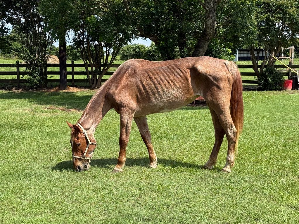 Dottie came to us in May 2025. She was emaciated, covered in dirt, mud and manure. She was missing patches of hair as a result of skin infection. At approximately 25 years old she certainly deserved proper care, nourishment and a place to retire. She is doing absolutely wonderful and we treasure her presence and personality!